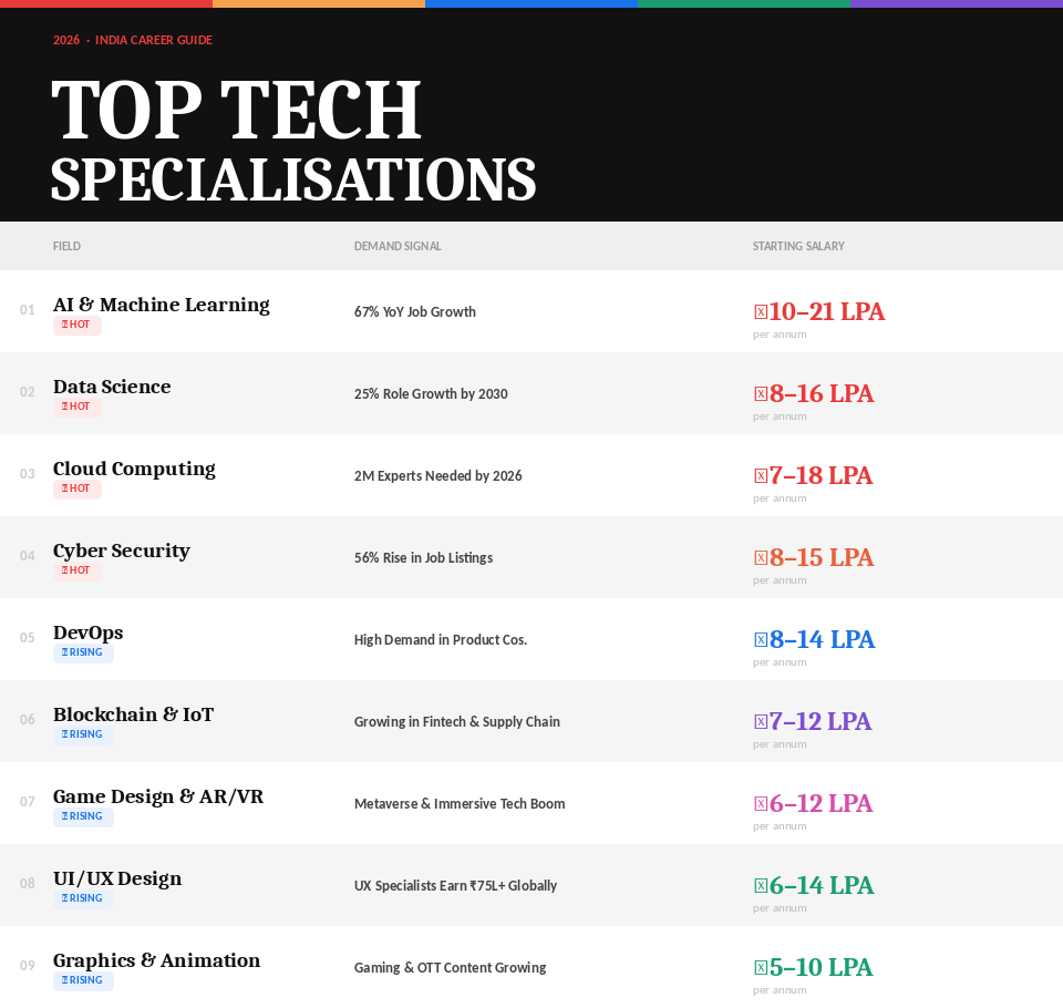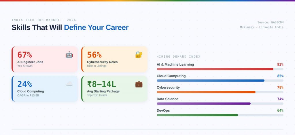 67% — Year-on-year growth in AI engineer job postings in India 56% — Rise in cybersecurity job listings in 2026 24% CAGR — Growth rate of India’s cloud computing market, projected to hit $13.5B by 2026 ₹8–14 LPA — Average starting package for CSE/AI graduates from top private universities in 2026